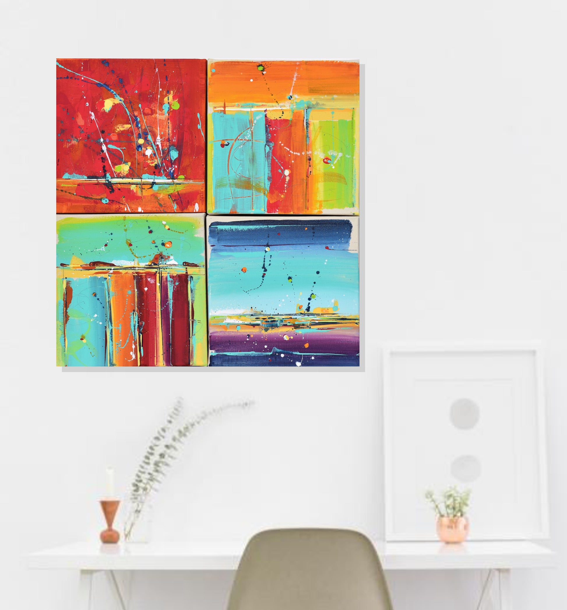 Four separate 8"x8" paintings for the price of one! Add a pop of art anywhere with these fun-size paintings! Instantly brighten up a cozy space. Or hang them all together, and be creative with your own gallery wall.