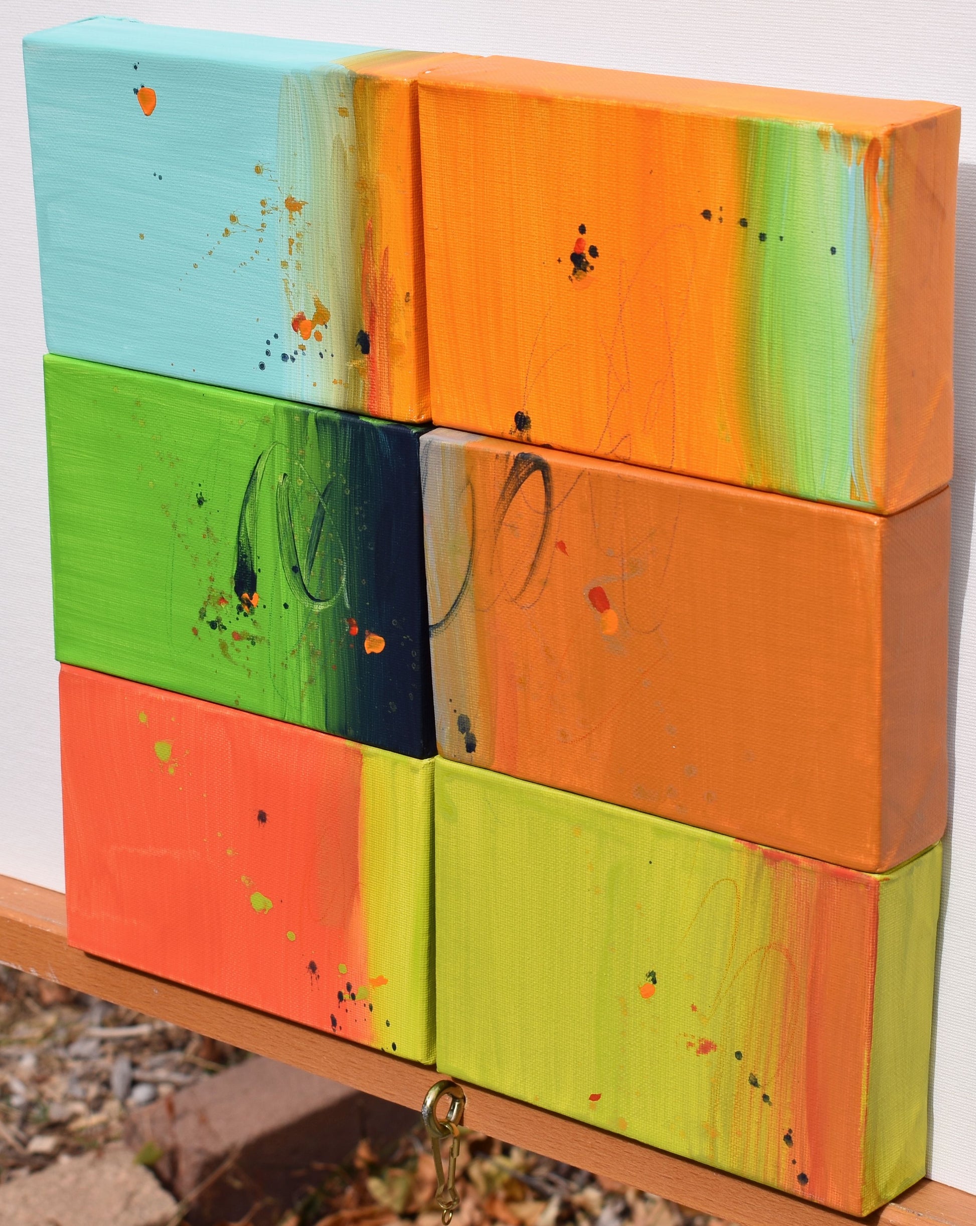 Each cute little 4"x6" miniature canvas has a full-width professional grade wooden stretcher and painted edges, yet fits anywhere easily. An irresistible dash of art! Looks great alone or with all six hung together.