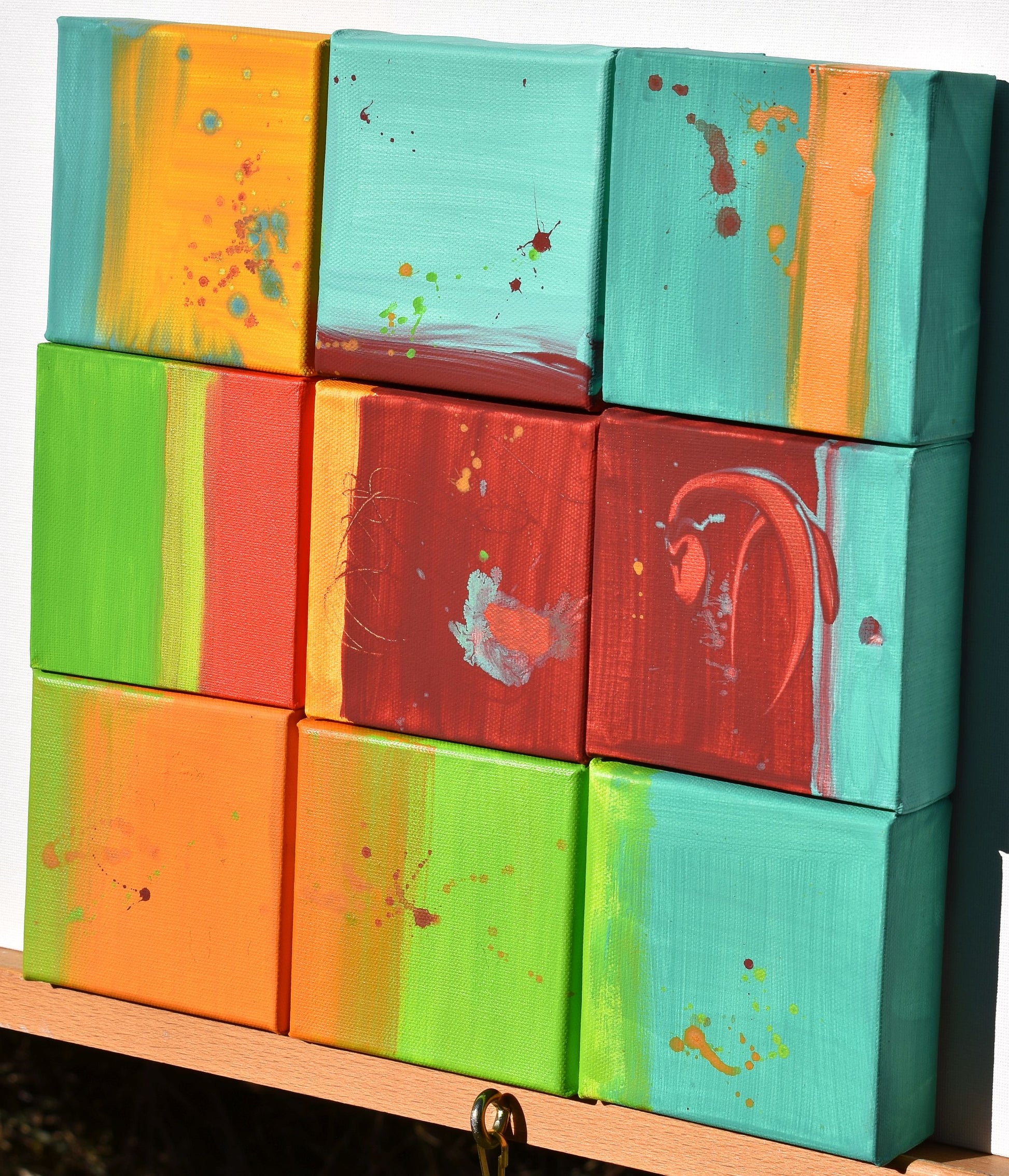 This set of nine vibrant 4"x4" oil paintings offers endless possibilities—display them together for a striking gallery wall or place them individually to add a cheerful touch to any space. Bright, bold colors celebrate the blossoming possibilities of the future, bringing energy and joy wherever they go.