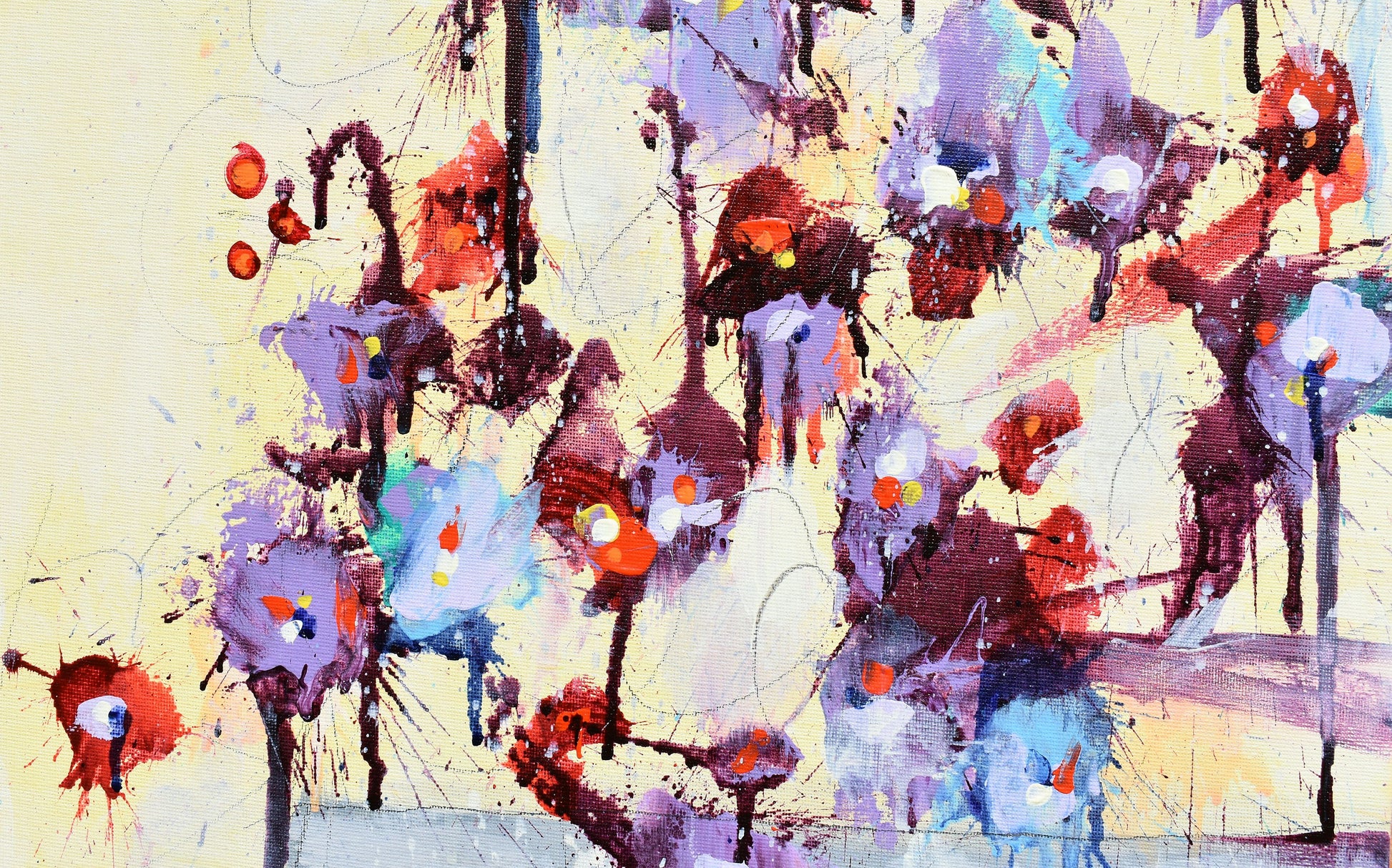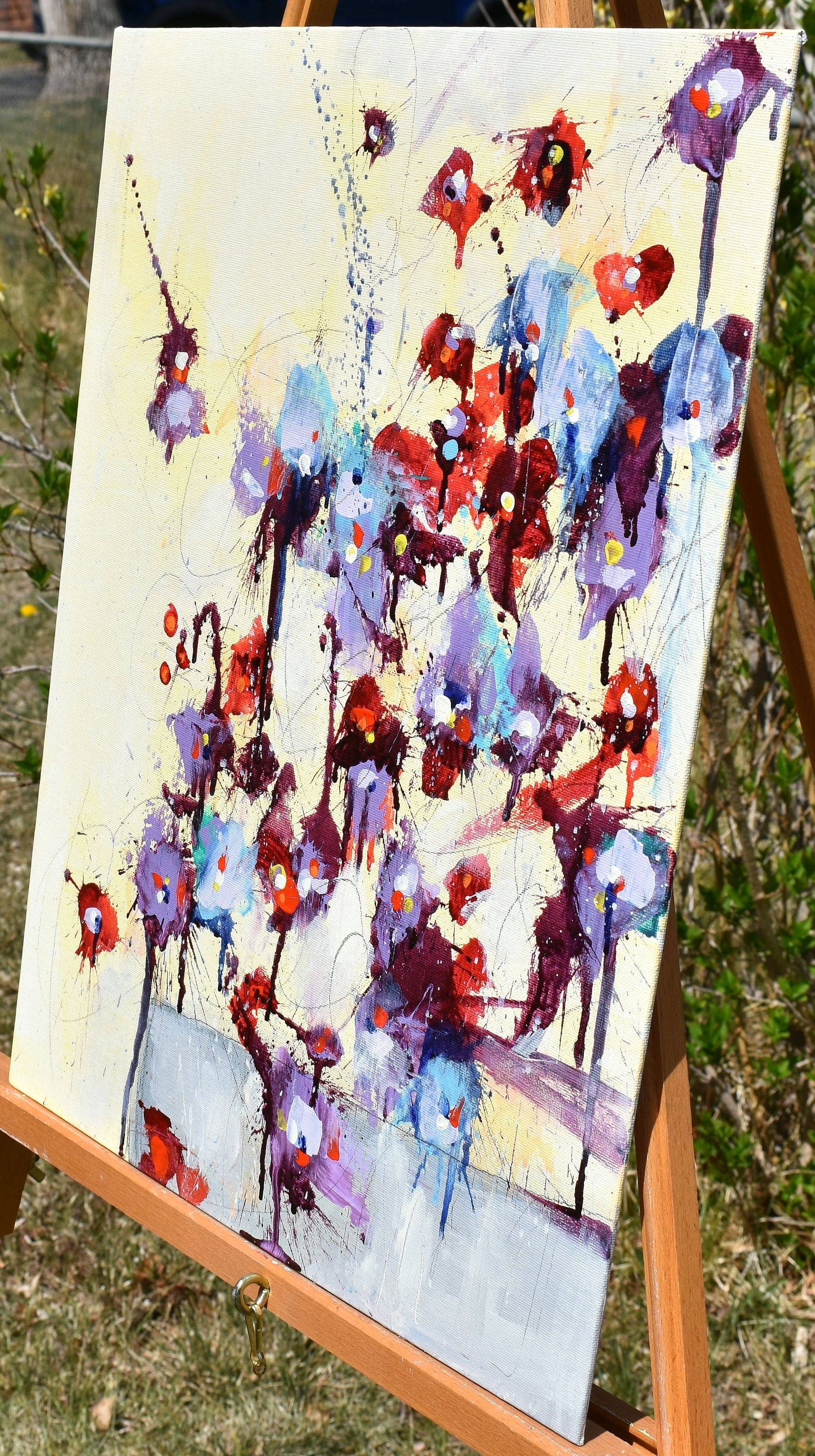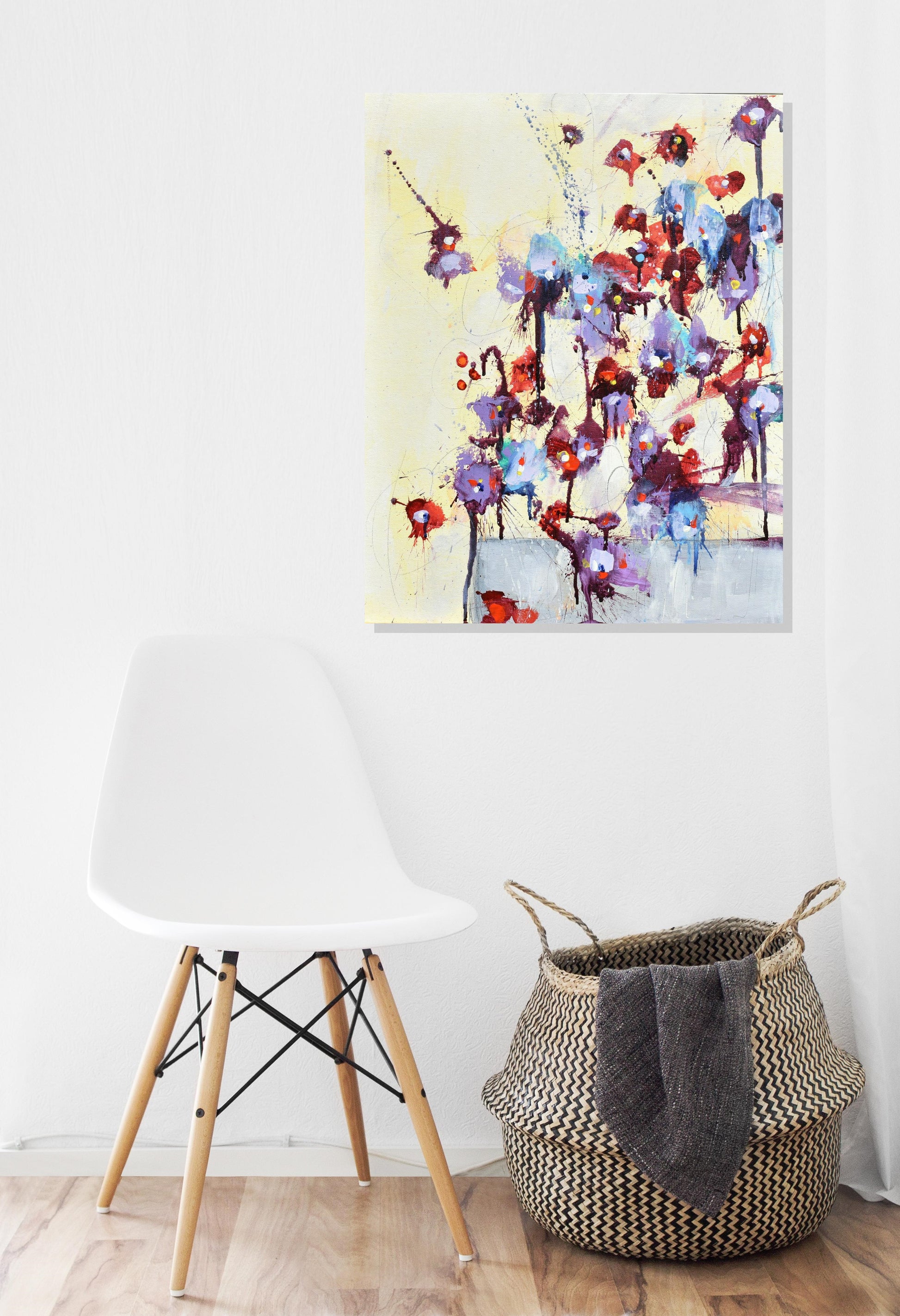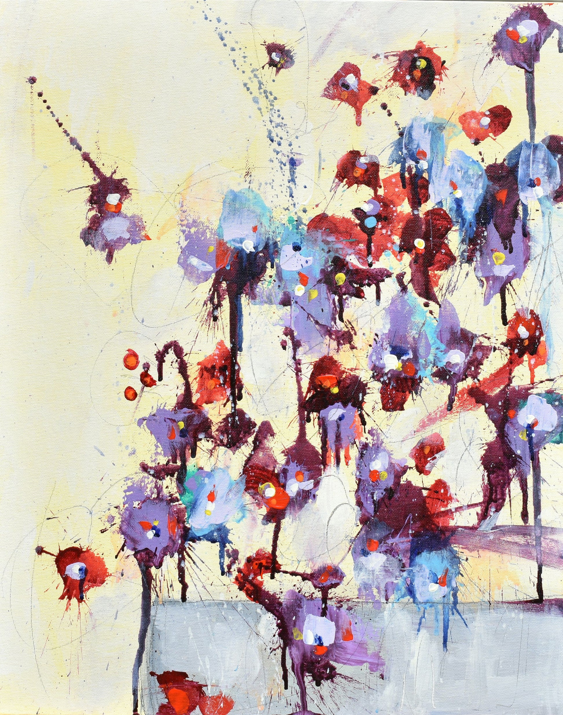 Écoutez Les Fleurs (Listen To The Flowers) is part of my flowers series, where every painting is inspired by a unique real-life bouquet of flowers. I build on the energy and the feelings I get from the individual flowers and how they are arranged.