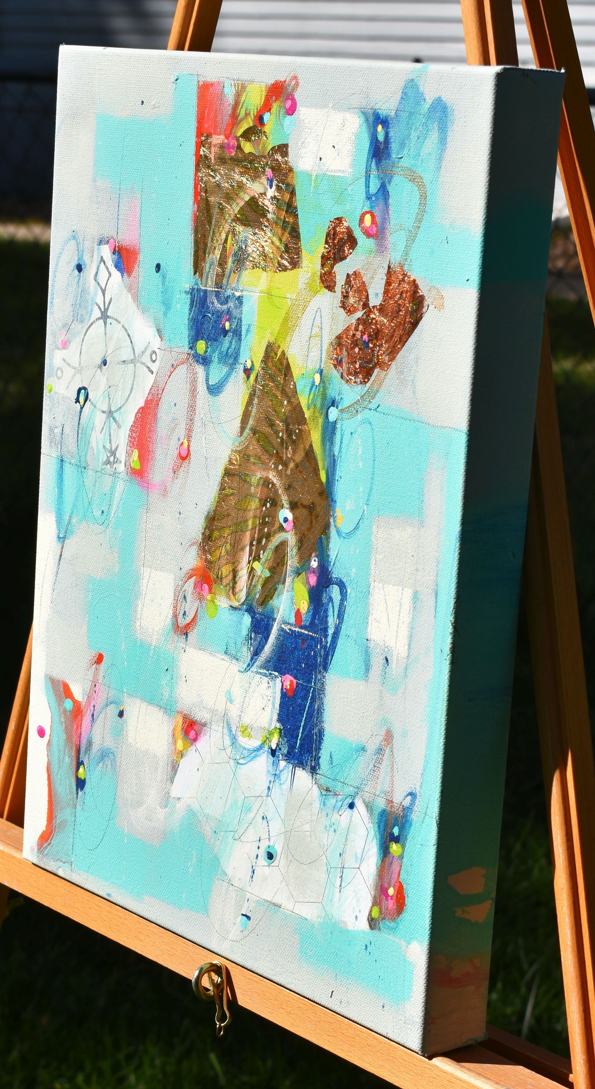 "Spirit of Infinity" was inspired by the beauty of September as it begins to yield to the first hints of Fall. The painting reflects the delicate interplay of light and shadow at this turning point of the year, with shimmering layers of gold and copper leaf illuminating the surface. These metallics symbolize both the lingering warmth of the sun and the promise of renewal beyond the stillness of fall and winter evoking a sense of quiet transformation, resilience, and optimism.